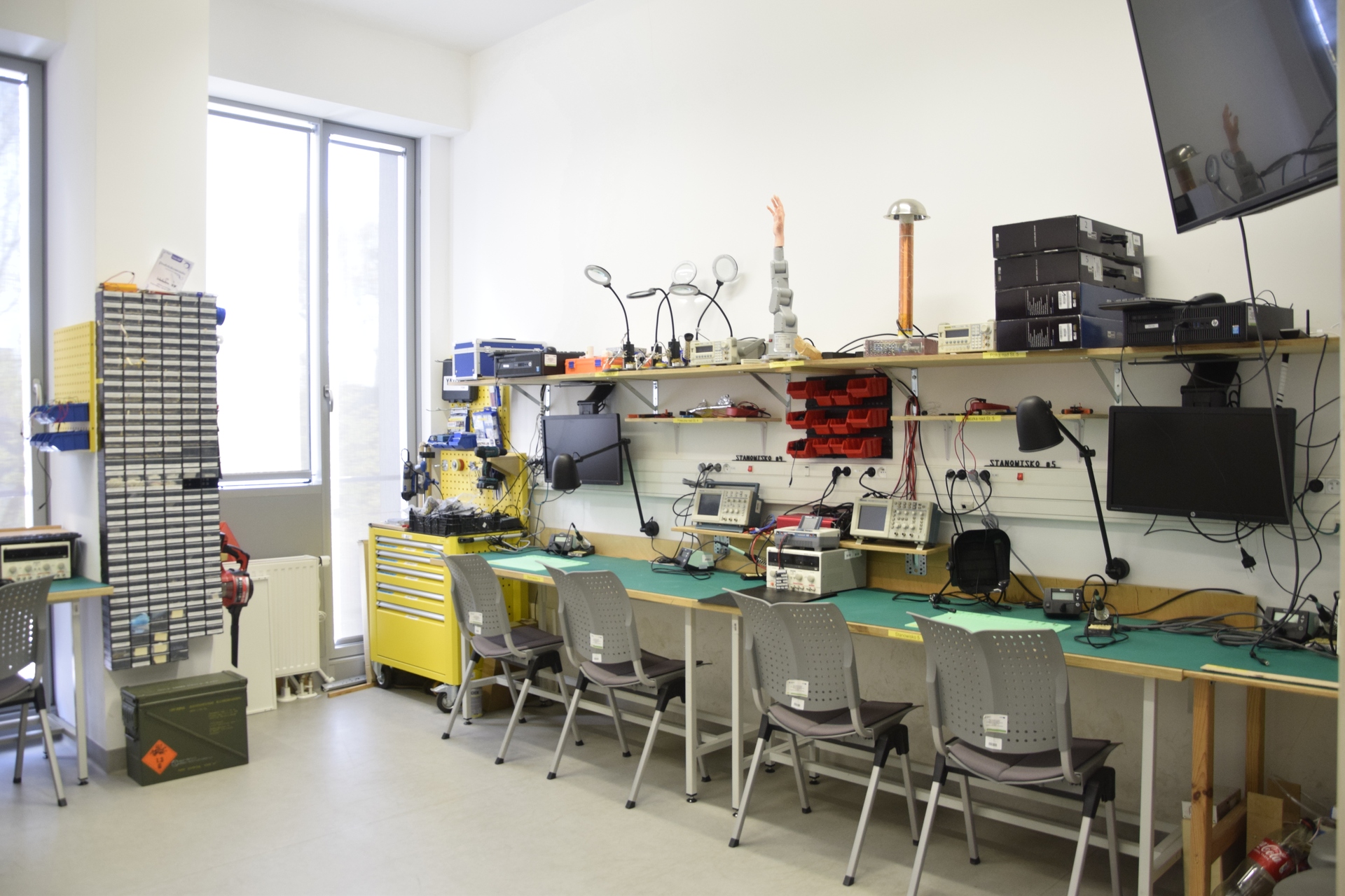 zdjęcie stanowisk z pracowni elektronicznej ze sprzętem