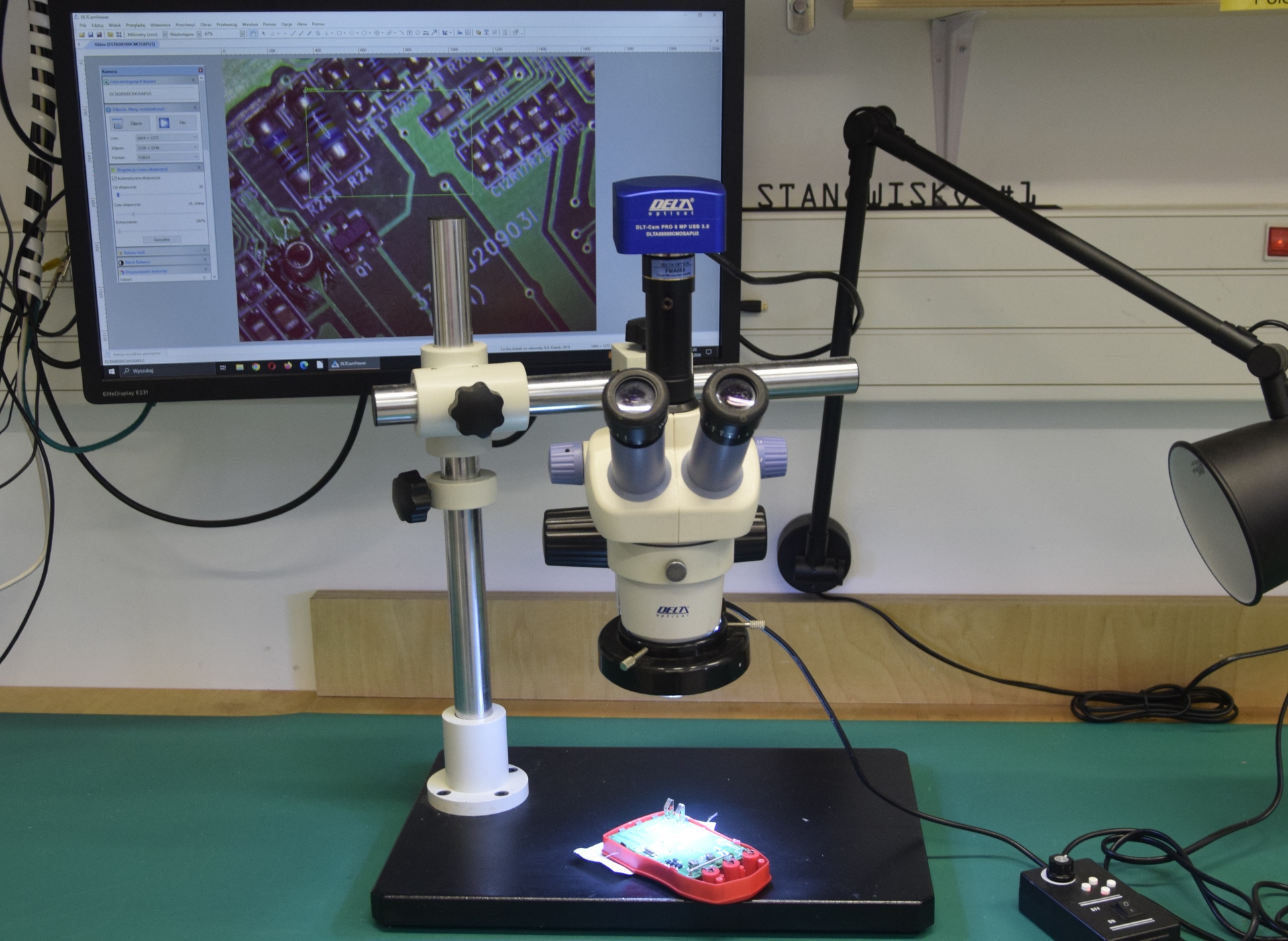 - Służy do programowania, analizy danych oraz sterowania różnymi urządzeniami w pracowni, w tym mikroskopem lutowniczym. Zapewnia szybkie przetwarzanie informacji i sprawną obsługę narzędzi pomiarowych.