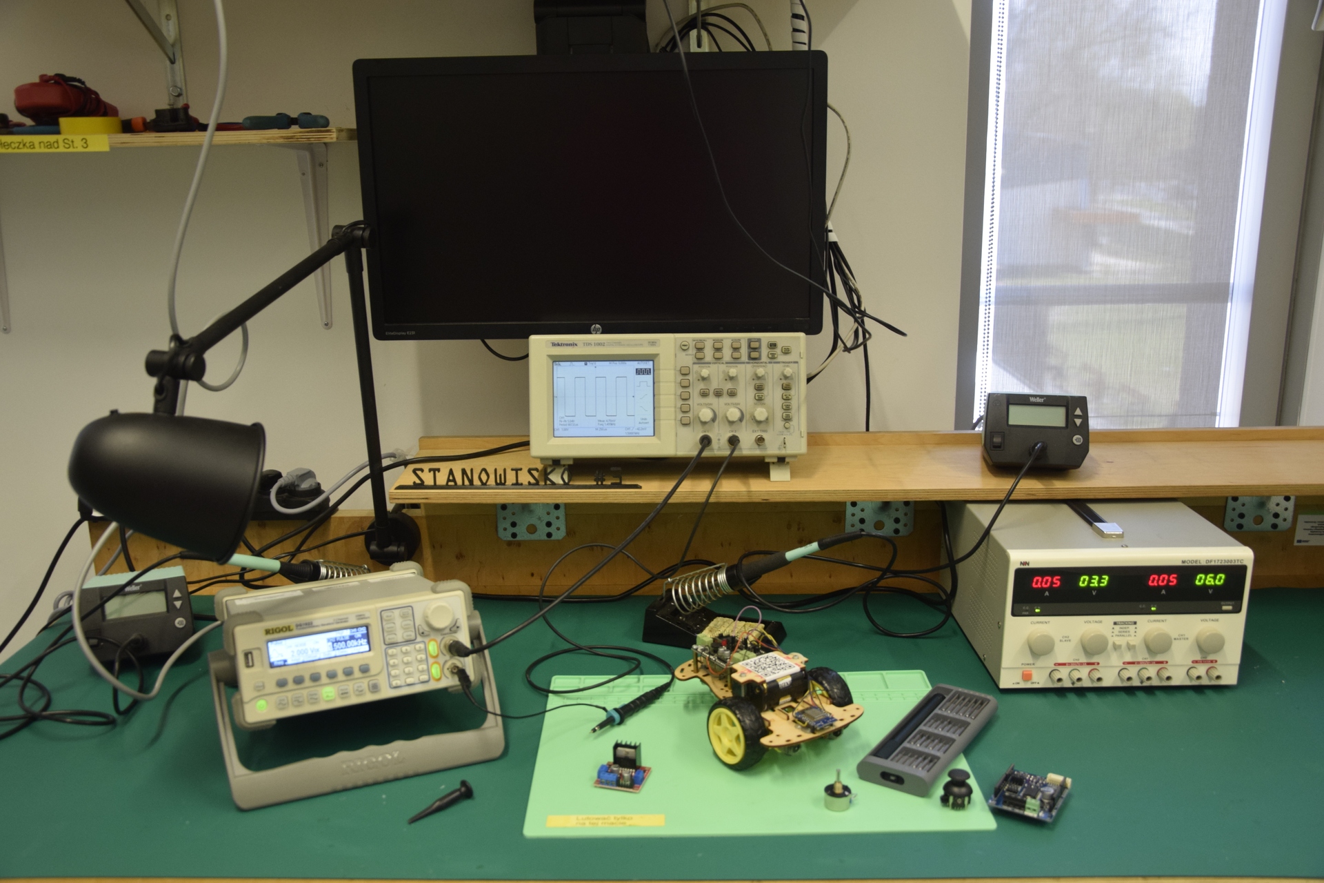 zdjęcie stanowiska z pracowni elektronicznej ze sprzętem